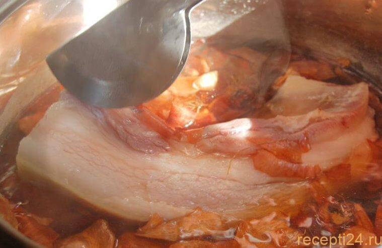 Приготовив грудинку в луковой шелухе, вы получите изысканное и безумно вкусное блюдо, которое идеально подходит и для закусок, и как основное блюдо.