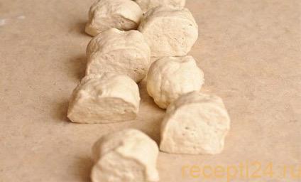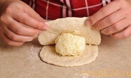 Из перечисленных компонентов замешивают эластичное тесто, которому нужно дать время, чтобы оно «поднялось». Затем основу разрезают на порционные кусочки и приступают к приготовлению творожно-сырного угощения.
