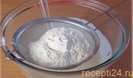 Поместите в глубокую миску сухие ингредиенты: муку, соду, соль, затем тщательно перемешайте компоненты.