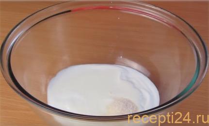 Добавьте в ёмкость кефир или натуральный йогурт и тщательно перемешайте ингредиенты.