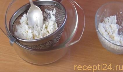 В отдельной ёмкости измельчите творог, для этого можно воспользоваться блендером или перетереть столовой ложкой через сито. В готовой смеси должны отсутствовать крупные кусочки молочного продукта.
