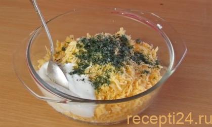 Выложите измельчённый молочный продукт к сыру, тщательно перемешайте компоненты, не забывая посолить, поперчить и добавить мелко порубленную зелень.