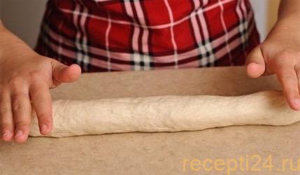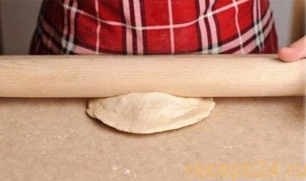 Тесто разрежьте на равные кусочки, затем раскатайте из них тонкие сочни.