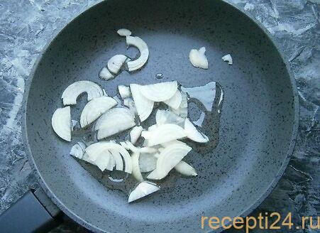 Лук необходимо порезать на кусочки и обжарить в масле.