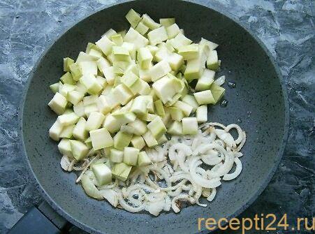 Туда же добавляют кабачки и обжаривают на медленном огне 10 минут. Овощи нужно тщательно помешивать для того, чтоб они равномерно прожарились.