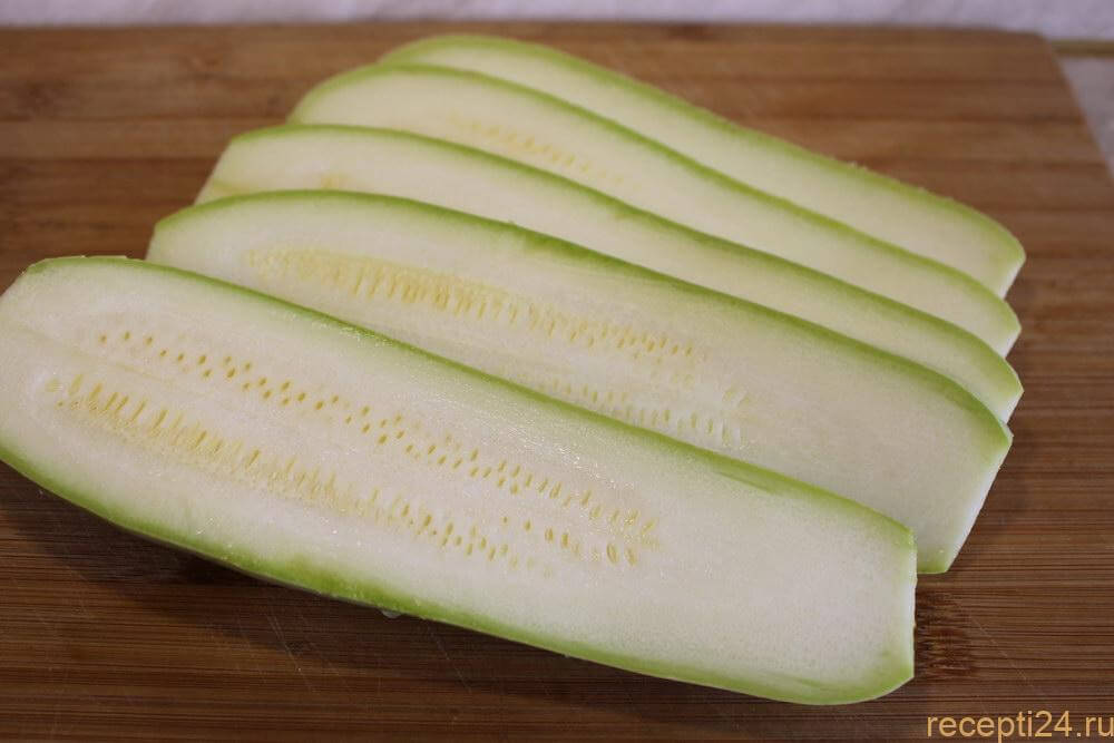Готовим кабачки. Тщательно моем под проточной водой овощ. Обрезам плодоножку и переднюю часть. Нарезаем тонкими пластинами вдоль кабачка.