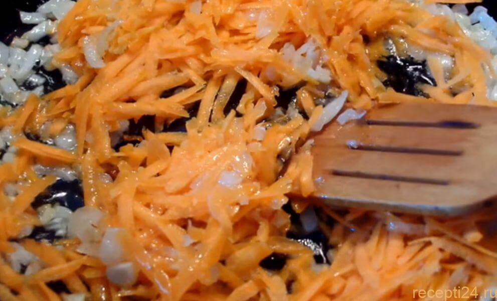 Сразу же добавить натертую морковь и тушить 2 минуты постоянно помешивая.