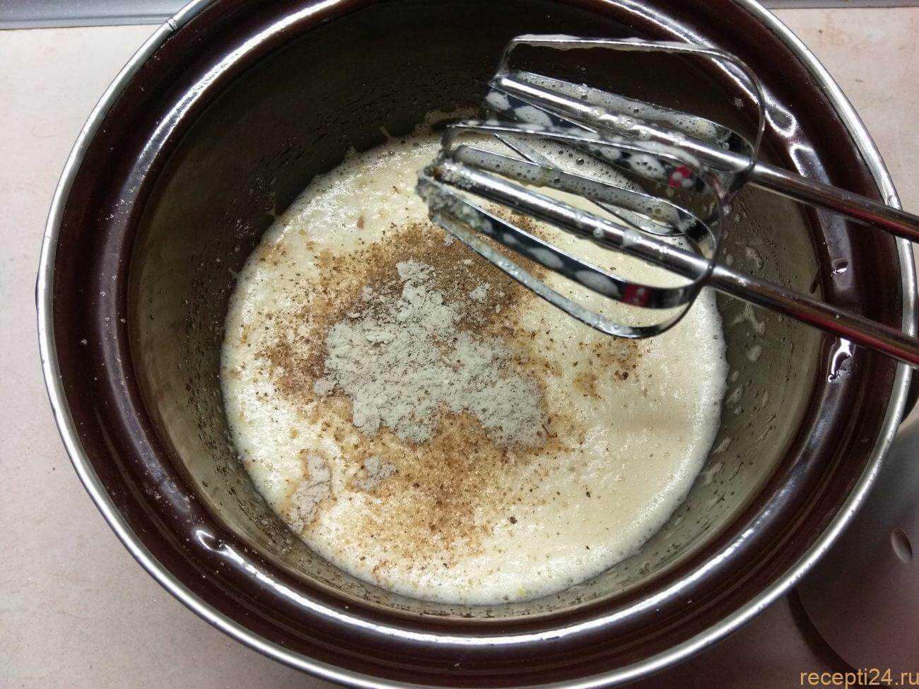 Готовим соус. В кефир добавляем яйцо, соль, перец черный молотый и мускатный орех по желанию. Взбиваем массу блендером до образования пены. Отставляем в сторону соус.