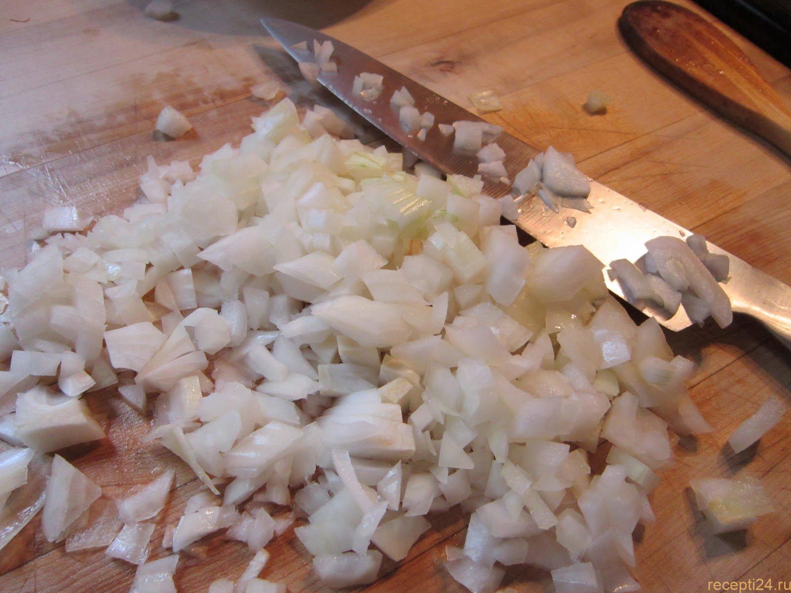 Очистить луковицу. Промыть её в холодной воде и нарезать кубиками.