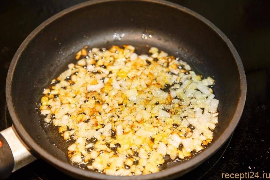 Положить нарезанный лук и обжарить до золотистого цвета.