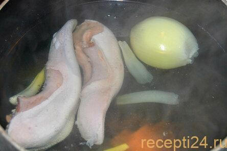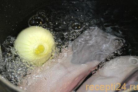 Наполните кастрюлю снова водой и положите очищенную луковицу. После закипания так же можно добавить лавровый лист 1-2 шт. горошины перца, солить надо в конце варки.