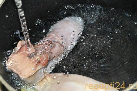 После варки, язык нужно очистить от шкурки. Что бы упростить этот шаг, наливаем в кастрюлю холодной воды и кладем языка в воду на 20 минут.
