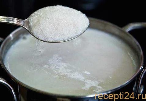 За минуту до готовности каши добавляем 15 г сахара 2 г ванили и тщательно перемешиваем подкипающую массу.