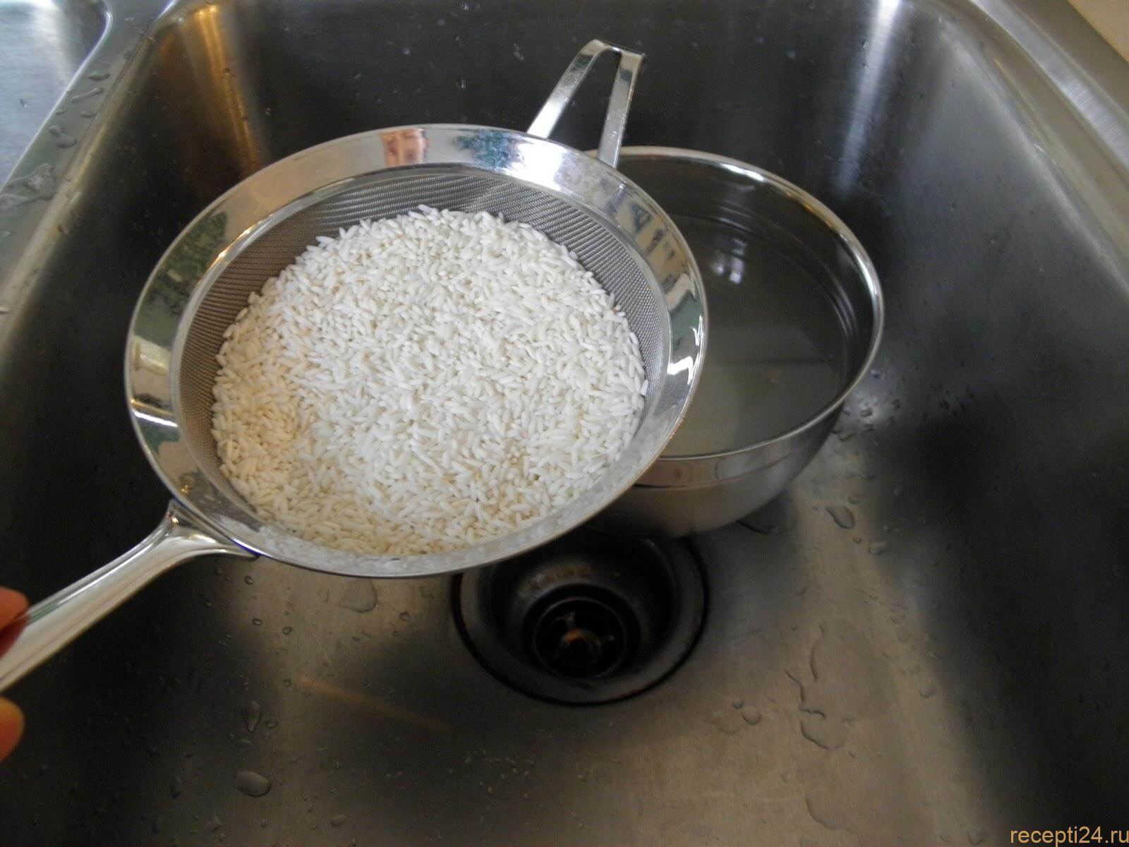 200 г круглозерного риса нужно внимательно просмотреть на предмет отсутствия в нем белых (недозревших), коричневых или желтых (испорченных) зерен. Затем, посредством дуршлага, промыть его под проточной водой.