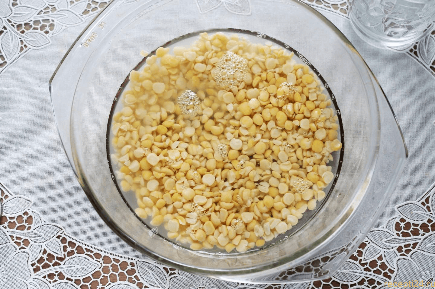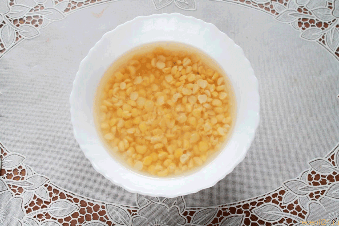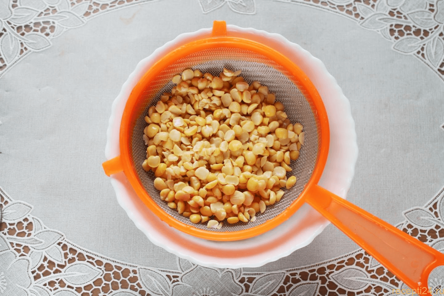 По прошествии указанного времени сливаем воду с разбухшего гороха, промываем его еще несколько раз.