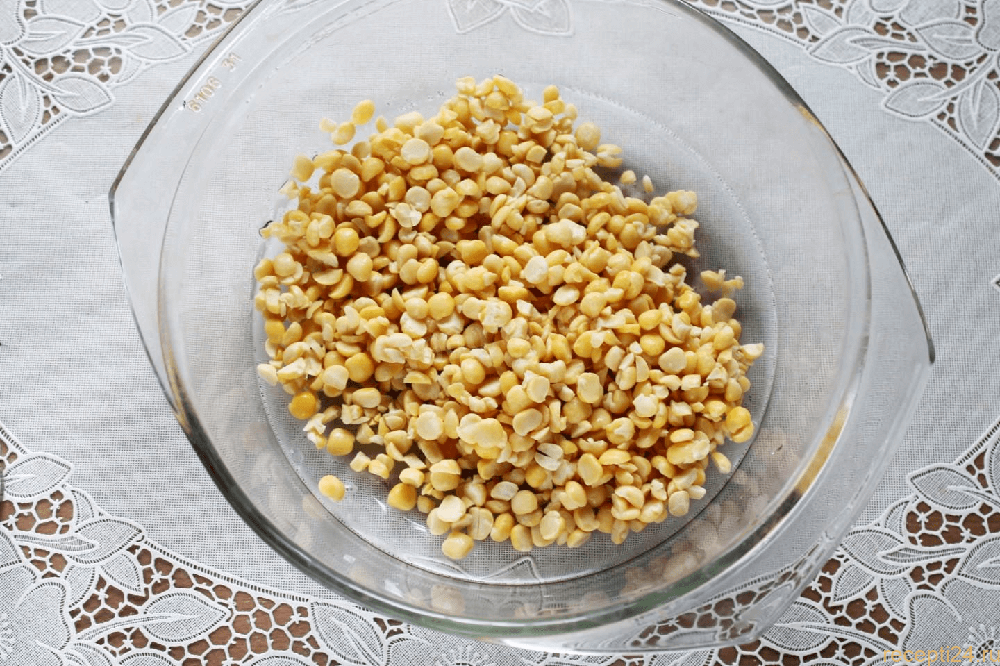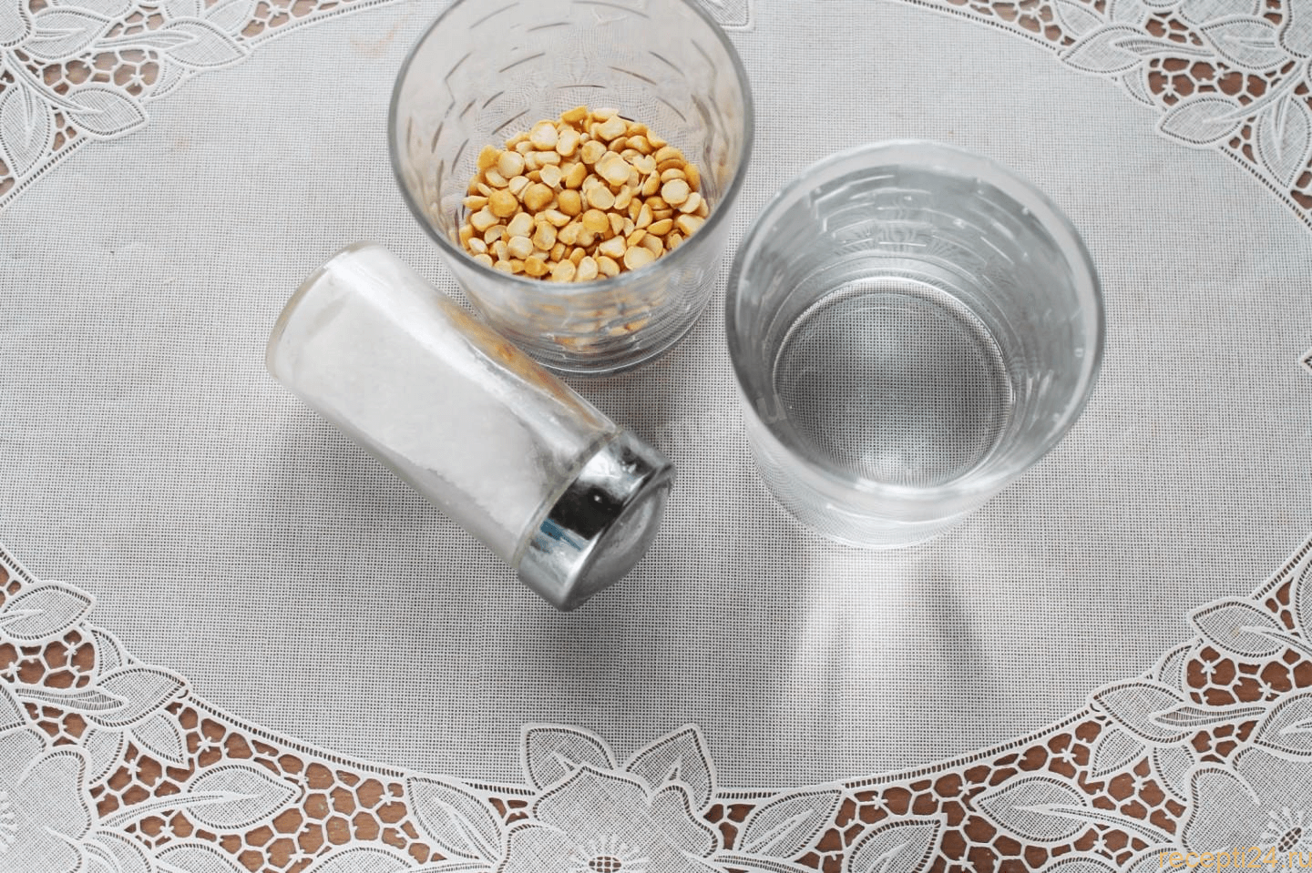 Для начала необходимо приготовить ингредиенты. Нам нужны будут вода, соль и гороховая крупа. Полстакана гороха нужно хорошенько промыть и замочить на 6 часов, лучше сделать это на ночь.