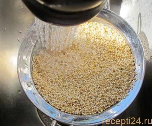 Оболочка киноа содержит органические вещества сапонины. Они не только придают продукту горьковатый вкус, мыльную консистенцию, но и наносят вред работе желудка и пищеварительной системы в целом, а в больших количествах токсичны. Поэтому крупу обязательно перед приготовлением промывают в проточной воде в течение 3-5 минут. Удобно это делать в мелком сите. Второй способ — замачивание на 3-4 часа. Выбирайте любой удобный для вас способ.