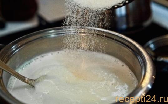 Через сито просейте крупу в кипящее молоко (помешивайте его при этом).