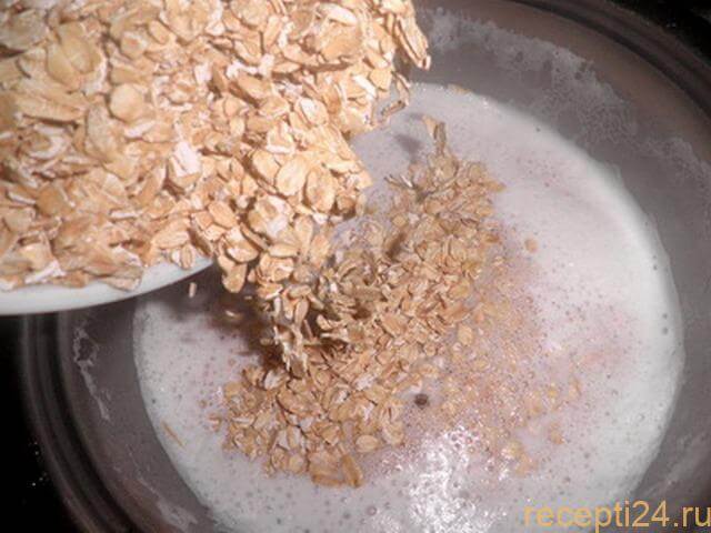 В закипающее молоко всыпаем 5 столовых ложек овсяных хлопьев «Экстра №1». Это большие и необработанные хлопья, которые нужно сравнительно долго варить. Сразу добавляем щепотку соли.