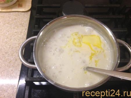 Через десять минут после того, как засыпали крупу, вы заметите, что содержимое кастрюльки начало густеть. В это время можно добавить масло, продолжая помешивать, варим еще 5 минут и снимаем с огня.