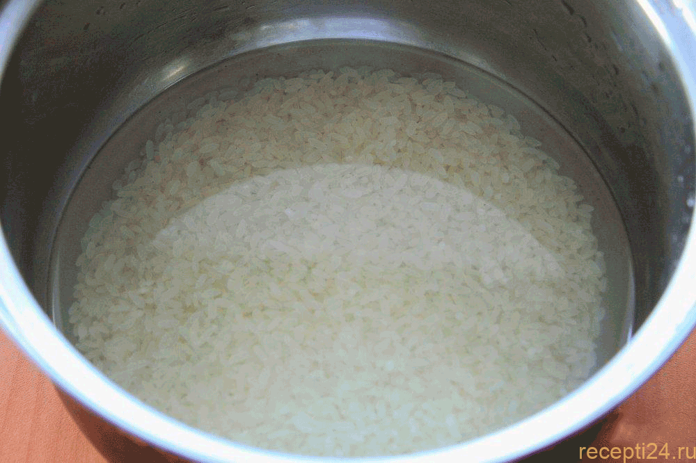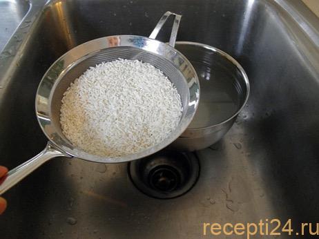 Один стакан риса кладём на дуршлаг или в чашу и тщательно промываем в холодной воде. Её необходимо несколько раз слить, пока она не будет оставаться полностью прозрачной. Наиболее оптимальным считается семикратное промывание. Также рекомендуется оставить крупу в воде на 20-30 минут, чтобы она вытянула всё лишнее. Важно промыть каждое зёрнышко и убрать некачественные, чтобы они не повлияли на вкус блюда.