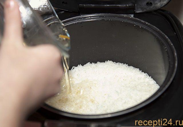 Берём глубокую кастрюлю с толстым дном, кладём в неё рис и заливаем водой. Пропорция должна быть 1:1,5. В данном случае необходимо 1,5 стакана воды.