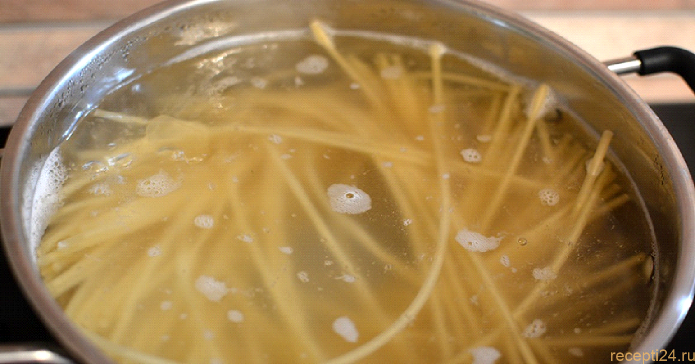В закипевшую воду в кастрюле опустить спагетти. Варить спагетти 10 минут.