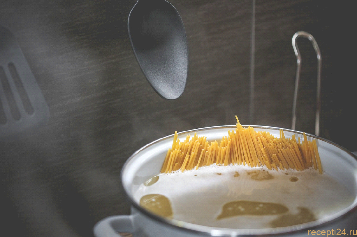 Когда вода начнет бурлить, аккуратно переложить в нее спагетти, распределяя их равномерно по дну. Обратите внимание! Спагетти в кастрюлю нужно выкладывать только в момент, когда вода закипит. Опускать их необходимо в форме веера. Не допускать разламывания на части.