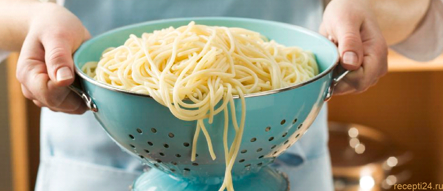 По истечение времени откинуть макароны в дуршлаг. Аккуратно слить лишнюю воду.