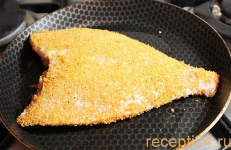 В роли панировки обычно используют муку или панировочные сухари, это дело вкуса. Если рыба плотная, крепкая, и в ее качестве вы уверены, то можно обжаривать порционные куски и без всякой панировки.