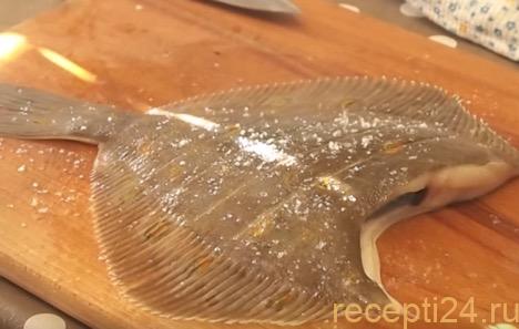 При чистке камбалы можно не срезать хвост и плавники, так как некоторые любят ими похрустеть, в зажаренном виде.