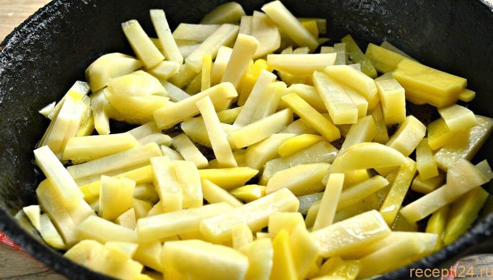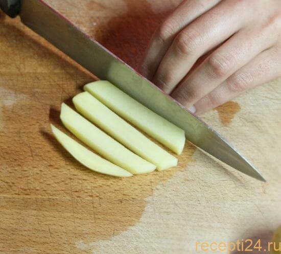 Приступаем к нарезке: особых рекомендаций по данному этапу нет, резать картошку можно так, как хочется. Стандартными способами являются виды нарезки брусочками, кубиками или тонкими слайсами.