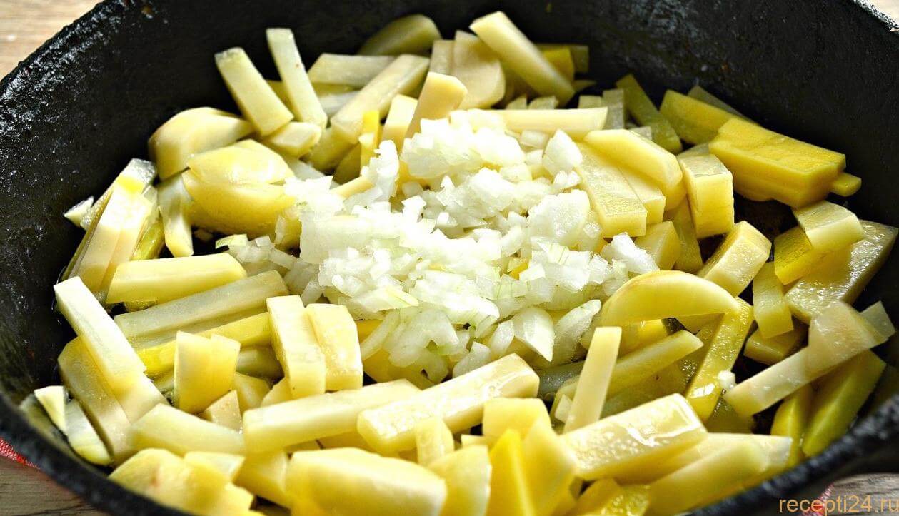 - Нашинкованный репчатый лучок добавляется к картошке приблизительно в середине процесса приготовления.