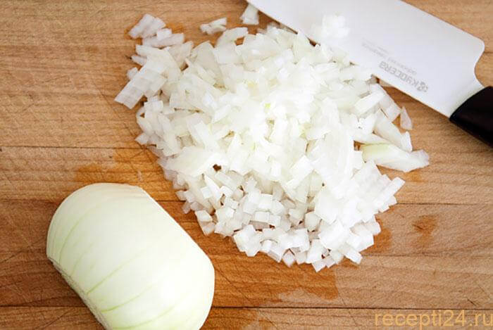 Репчатый лук нашинковывается маленькими кубиками – чем мельче, тем лучше, но без фанатизма.