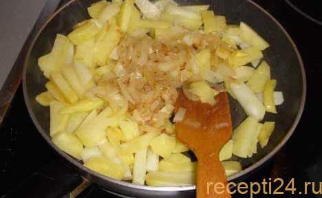 Блюдо готовится на сильном огне в течение пяти-семи минут после добавления картошки, лука и специй. По мере обжарки ингредиенты должны перемешиваться – для этого лучше использовать специальную деревянную лопаточку. Как только на кусочках картошки появится золотистая корочка, температура убавляется до среднего уровня. Время приготовления зависит от сорта овощей, но в среднем на полную прожарку уходит 15 минут.