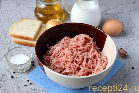 Подготовить набор продуктов. Фарш можно купить в магазине. Если готовить его дома, 250 г говядины измельчить более мелко, 250 г свинины — крупнее.