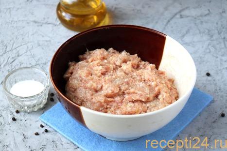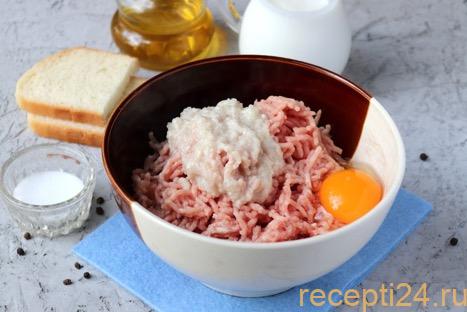 В 150 мл молока замочить 100 г свежего пшеничного хлеба и дать постоять около 5 минут. Затем размокшие комочки отжать и тоже добавить в фарш. Посолить, поперчить массу по вкусу.