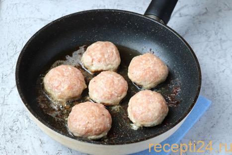 Смоченными в воде ладонями сформировать из фарша котлеты. Отбить их уже в ладонях, перебрасывая из одной в другую руку тоже 15 – 20 раз. Выложить на сковороду с хорошо разогретым растительным маслом.
