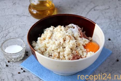 В 500 г свино-говяжьего фарша вбить 1 яйцо, добавить измельченные в мясорубке 100 г репчатого лука и 1 крупный зубчик чеснока.
