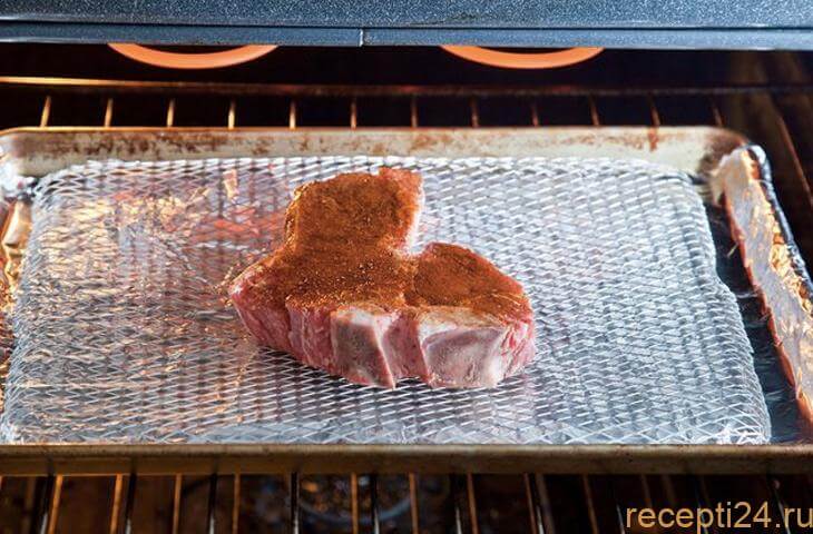 Возьмите противень и уложите на него лист пергаментной бумаги, тщательно закрывая нижнюю плоскость посуды. По истечении времени приготовления стейков, выкладываем мясо на противень с бумагой. Блюдо отправляется в духовку на 10 минут, при температуре 180 градусов.