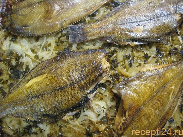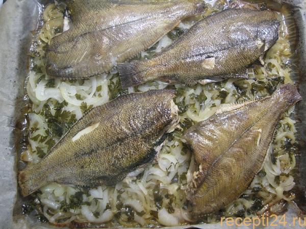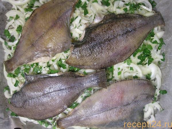 Запеченная камбала готова. Подавать вместе с луком. В качестве гарнира хорошо подходит рис.
