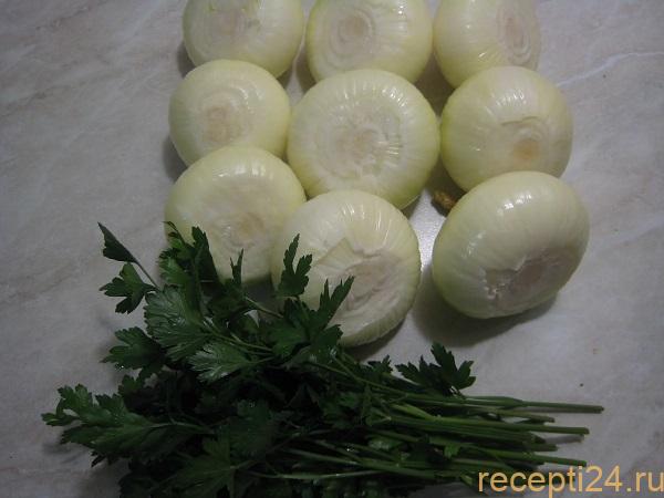 Очищенный 1 кг репчатого лука и 30 г петрушки вымыть и просушить полотенцем.