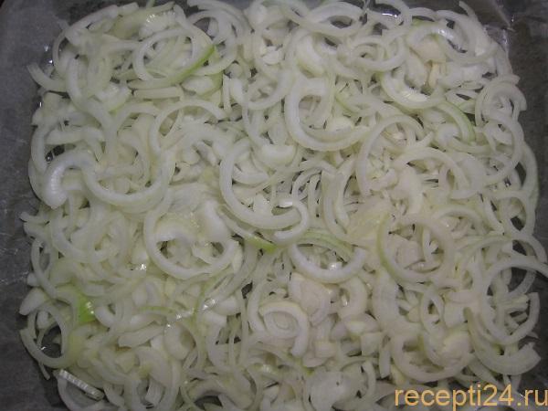 Застелить противень пергаментом или фольгой. Смазать 1 ст.л. растительного масла. Равномерно по всей площади выложить нарезанные полукольца лука.