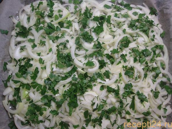 Смешать 2 ст.л. сока лимона 1 ст.л. растительного масла. Равномерно разбрызгать эту смесь над луком на противне. Притрусить петрушкой.