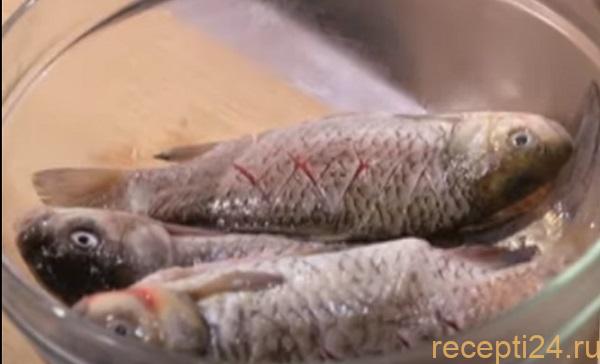 3 карася почистить от чешуи, выпотрошить и удалить жабры.