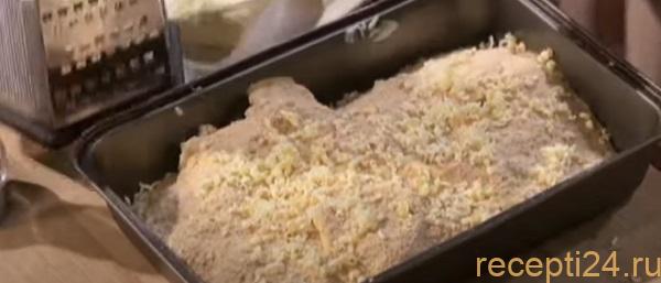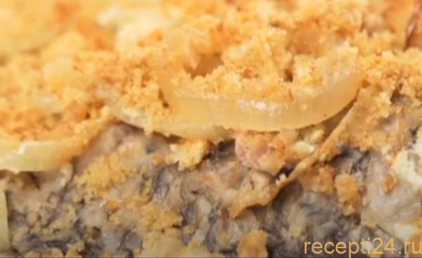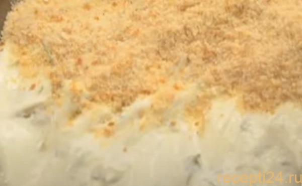 Сверху присыпать 50 г панировочных сухарей, чтобы на сметане образовалась плотная корочка без просветов. При необходимости количество сухарей можно немного увеличить.