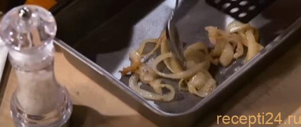 1 лук нарезать кольцами и обжарить на сковородке с 2 ст.л. подсолнечного масла до золотистого цвета. Затем выложить половину на противень с высокими бортами.
