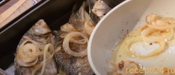 В один слой на кольца лука выложить припущенных на сковороде карасей. Стараться, чтобы одна рыба не прикасалась к другой.