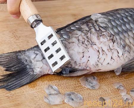 - Очищаем рыбу от чешуи. Делать это можно обычным ножом или специальным инструментом. Если чешуя большая и легко отходит, можно снять ее основную часть даже руками.