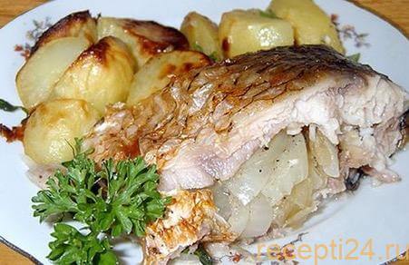 Запеченный карп разрезается на порционные куски и подается к столу с любым гарниром. Например, отлично подойдет запеченная картошка.